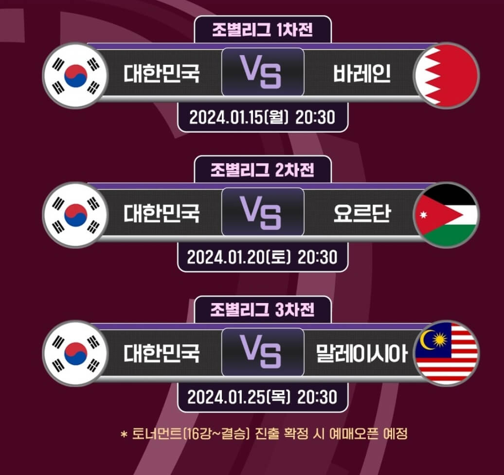 | 2024년 01월 15일 | 대한민국 v 바레인 | 14:30 (20:30) | E | 자심 빈 하마드 스타디움 |