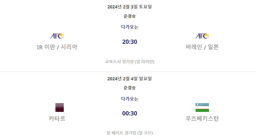 | 2.4. 일 00시 30분 | 카타르 vs 우즈베키스탄 |